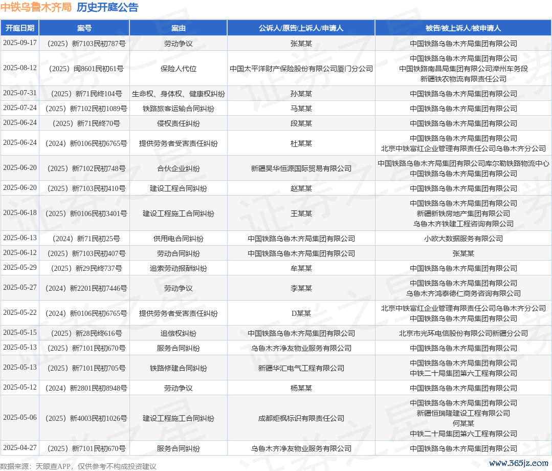 案号:(2025)闽8601民初61号审理法院:福州铁路运输法院案由:保障东谈主代位当事东谈主信息: 原告/上诉东谈主:中国太平洋财产保障股份有限公司厦门分公司 被告/被上诉东谈主:中国铁路乌鲁木皆局集团有限公司、中国铁路南昌局集团有限公司漳州车务段、新疆铁农物流有限拖累公司开庭日历:2025年8月12日把柄统计,近一年内以中国铁路乌鲁木皆局集团有限公司为当事东谈主的历史开庭公告有42则,其中案由为“做事争议”的公告以5则居首,其次为“生命权、肉体权、健康权纠纷”有3则,“征战工程公约纠纷”有3则。历史开庭公告(前20条)如下: